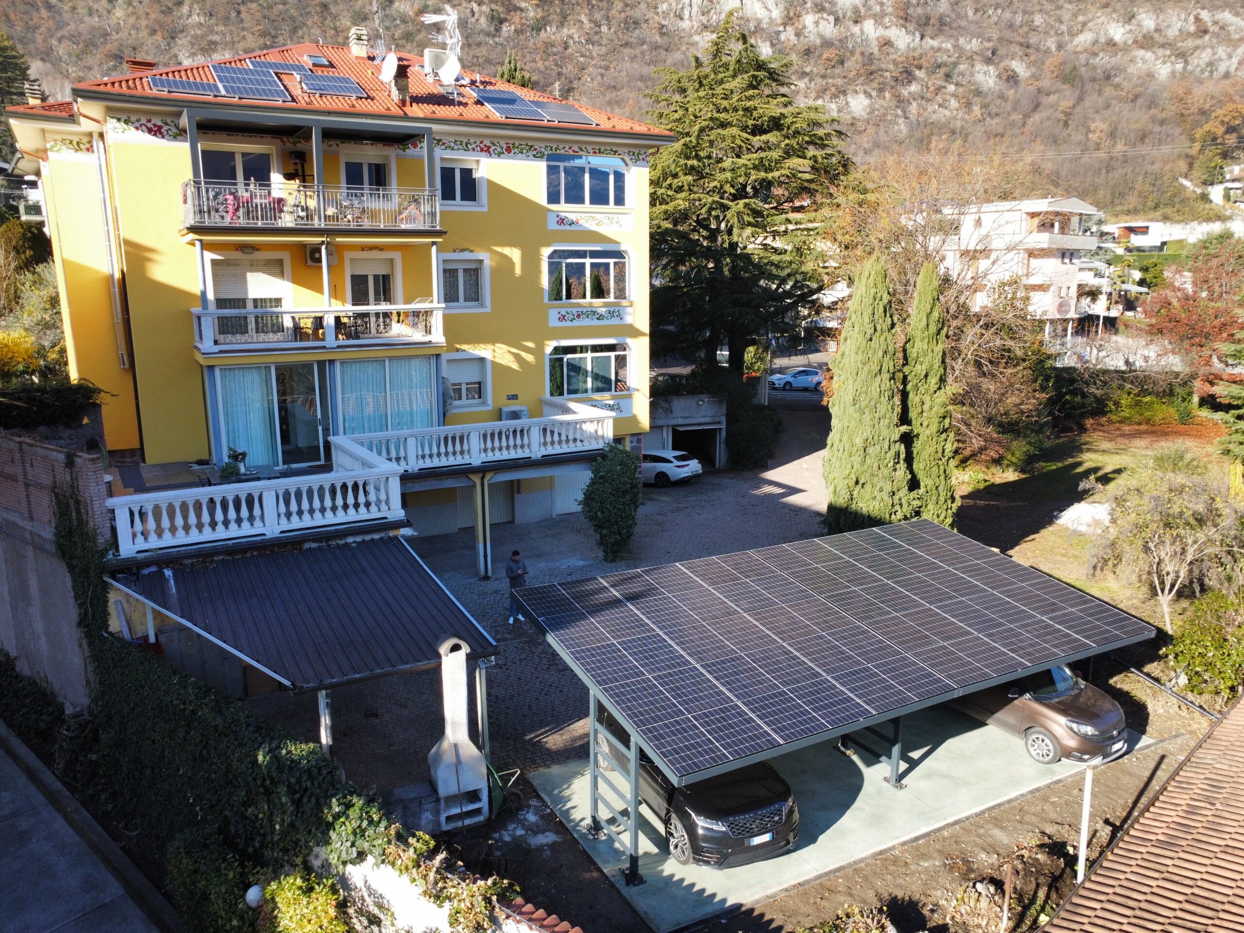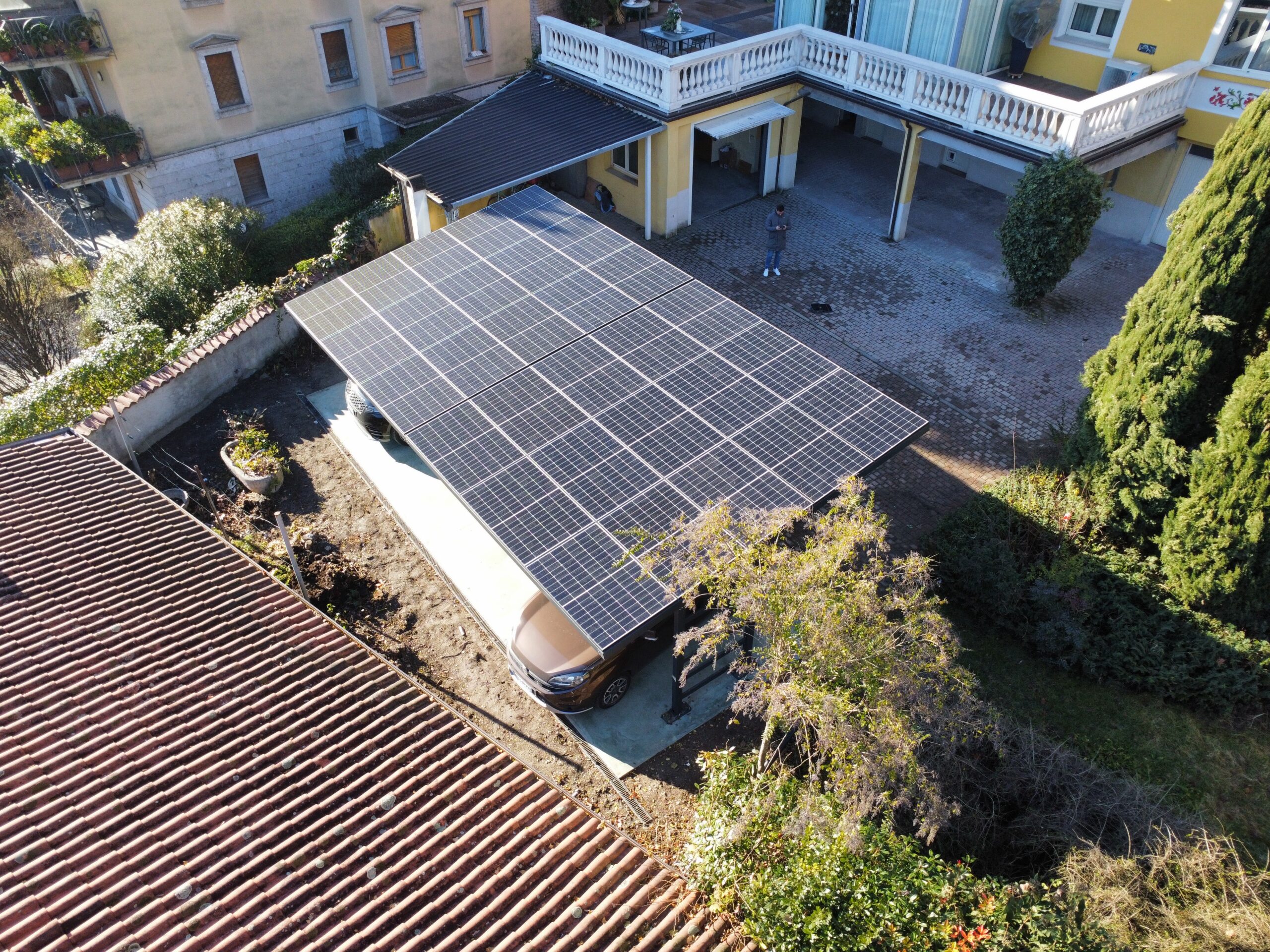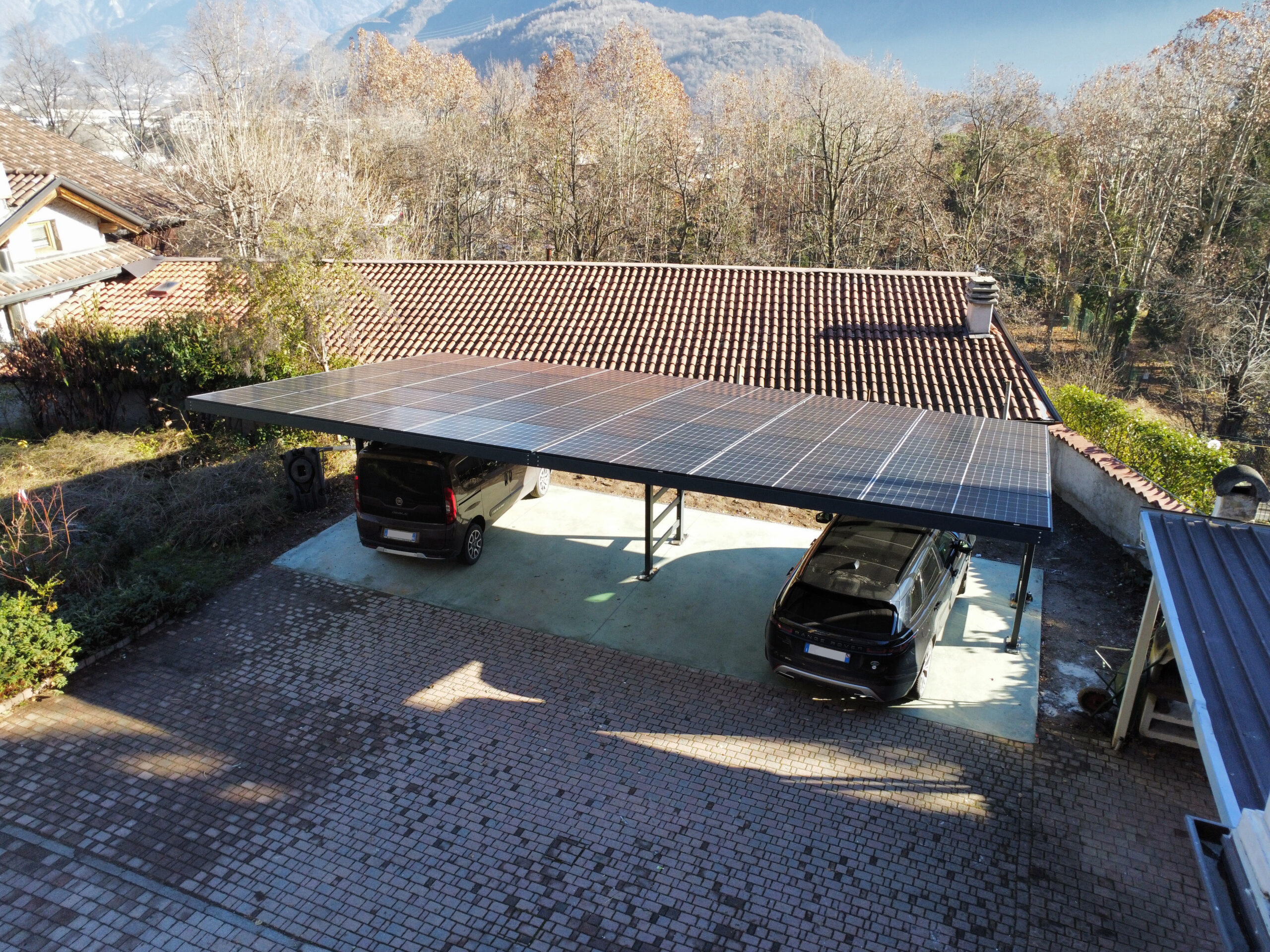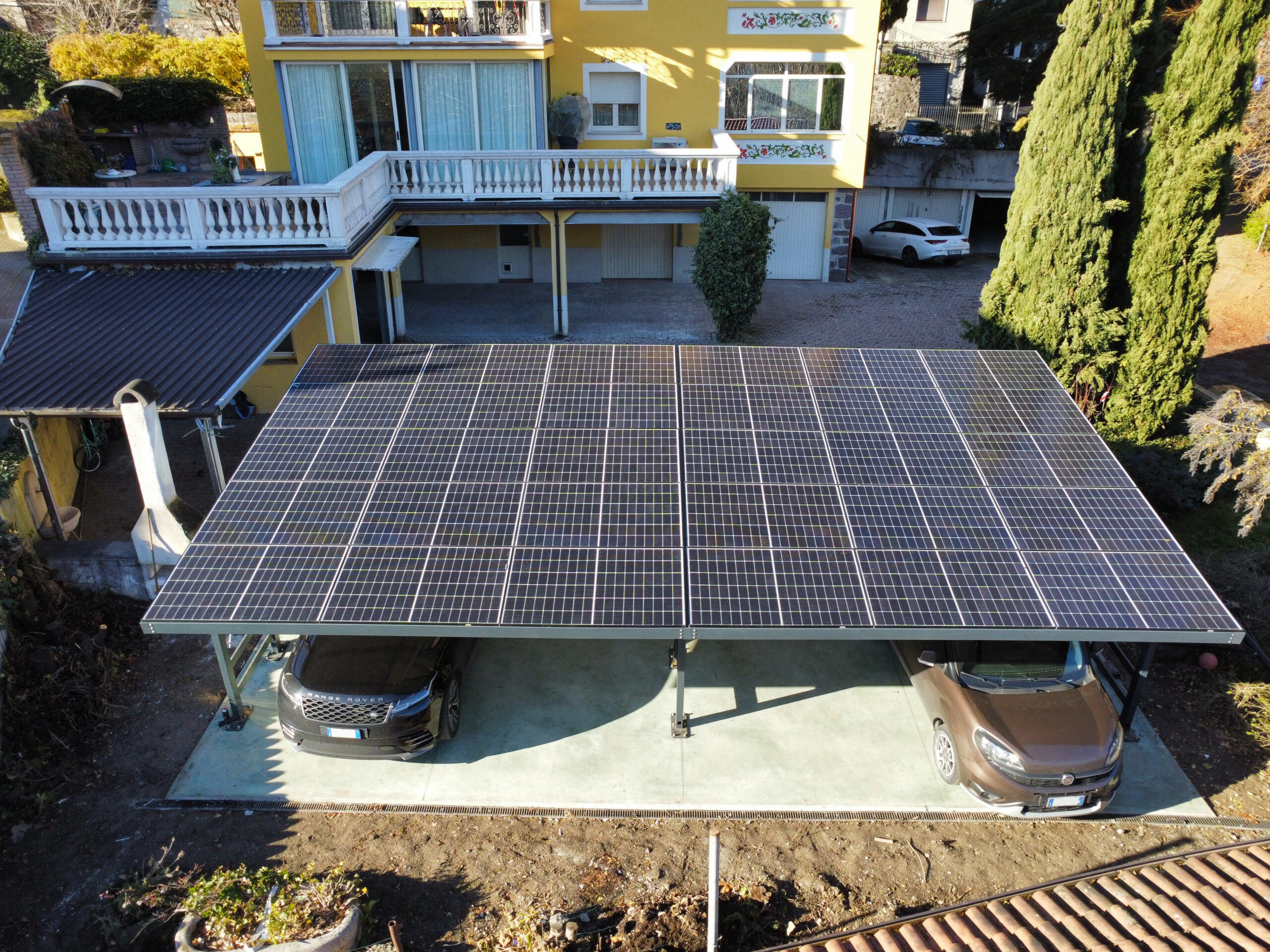 Impianto realizzato su pensilina utilizzata come tettoia per autoveicoli, dimensionato e realizzato sulla base degli effettivi consumi ed esigenze del cliente, sia in termini di spazio che di resa annua.
